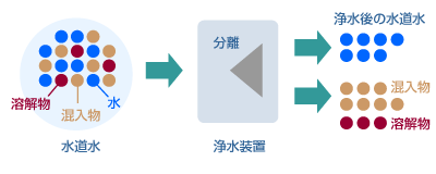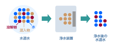 浄水装置に水道水を通すと、浄水装置内に混入物を留めるため、混入物を取り除いた水道水(溶解物混じり)を得ることができる方法です。この場合、浄水装置内に混入物が蓄積されるため、長時間に渡り利用し続けると逆に水質を悪化させる可能性があります。