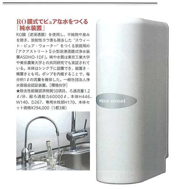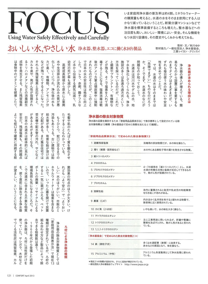 3月5日発売の雑誌「コンフォルト」4月号、浄水器の特集に掲載されました。 さまざまなタイプの浄水装置を比較、検討できる特集です。 『家庭用品品質表示法』で定められている除去対象物質は、13項目。 当社の浄水器は、中空糸膜式浄水器で除去できる13項目を含む50項目の除去性能が確認されています。 あらゆる不純物を取り除く『純水装置』として紹介していただきました。